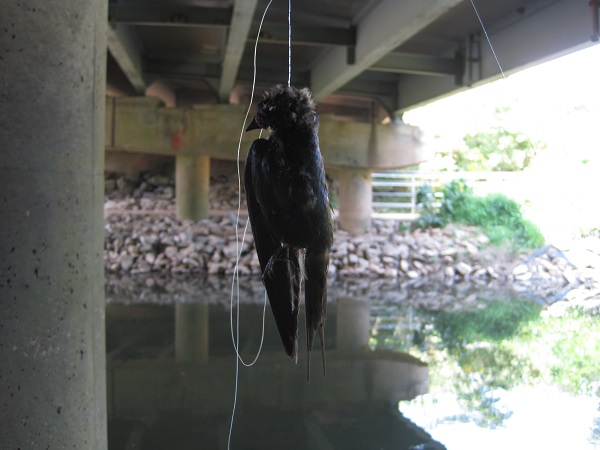 Fisherman, take it home! The sad and macabre end of a cliff swallow, tangled in discarded fishing line and caught dangling under the Little River Turnpike bridge over Accotink Creek. A small colony of swallows has nested under this bridge for years, delighting passersby with their graceful gliding flight over the water and the marvel of their tidy nests constructed of balls of mud. Or delighting almost everyone, it seems, for sadly we have seen recent signs of rock throwing directed at the nests.