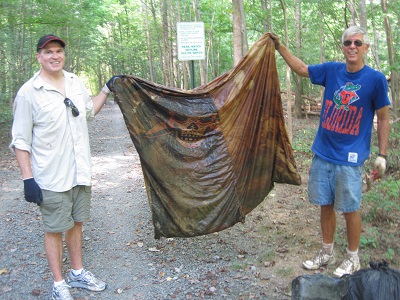 Our volunteers braved one of the hottest, most humid days of the summer on the first day of our International Coastal Cleanup.. At our Pickett Road site, we found a "hot spot" where a bicycle, weed whacker, two tires, two lacrosse balls, and an orange traffic cone had all accumulated in one spot. Thirteen volunteers joined the effort here. At our Barkley Drive site, we had fourteen volunteers. The dreaded Pirates of the Accotink raised the Jolly Roger in the form of a skull and crossbones design poncho found in the creek. Here also we met and were joined by a group of folks working to preserve the nearby Thompson Farm property at 8915 Lee Hwy as open space and community gardens. Thanks Thompson Farmers! This site is along the Bear Branch tributary of Accotink Creek, so let's hope we can help their efforts. Our most unusual (and deadly) find here was a full quart bottle of synthetic motor oil. At our Woodburn Road site, the humidity had dropped considerably. A short crew of only four volunteers worked this site, but managed to collect 18 bags of trash. Just at quitting time, we discovered a trash raft of thousands of bottles and other floatable rubbish, but had to leave it behind. A baseball and a can of dipping tobacco found together point to the inescapable conclusion that major league baseball has come to our watershed. The hip flask we found may or may not point the same way.