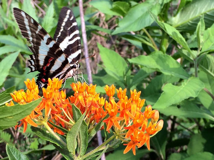 Protographium Marcellus, Zebra swallowtail, on Asclepias tuberosa, Butterfly weed, Accotink, 7-1-15