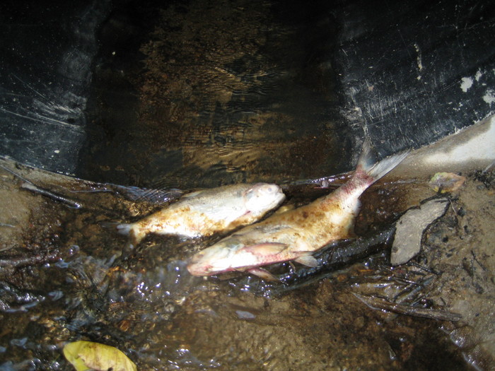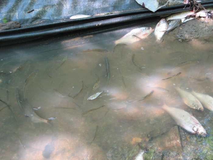 On September 7, I went back and photographed the damage. Downed trees were all along the creek and some along the trail. Most of the new culverts suffered serious damage. The silt fencing and the orange net fencing were severely damaged. Some of this washed away and became deadly debris downstream. The most shocking of all sights was that hundreds of fish were dead on the trail and dozens or hundreds more were trapped in puddles and blocked culverts or were caught in the temporary fencing. I couldn't walk down the trail without watching where I stepped so that I did not step on a fish! This was over a section a mile long. I did not walk the other mile, which I hear was worse. The fish were trapped because of the fencing and raised grading of the trail.