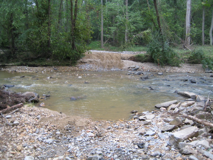 On September 6, 2008, Tropical Storm Hannah delivered approximately 7 inches of rain in Springfield This is greater than the 10-year rainfall event that the CCT bridges are designed for. I went to the site of the trail paving around 5:30 pm in the area about a mile downstream of the LAP dam, where the clearcut is for the first bridge crossing below the dam. I could only get to the edge of the steep slope above the clearcut. The water flooded the entire valley, up to the steepest slopes. The current at the edge was about 5 miles per hour, and the creek was whitewater (raging fast).
