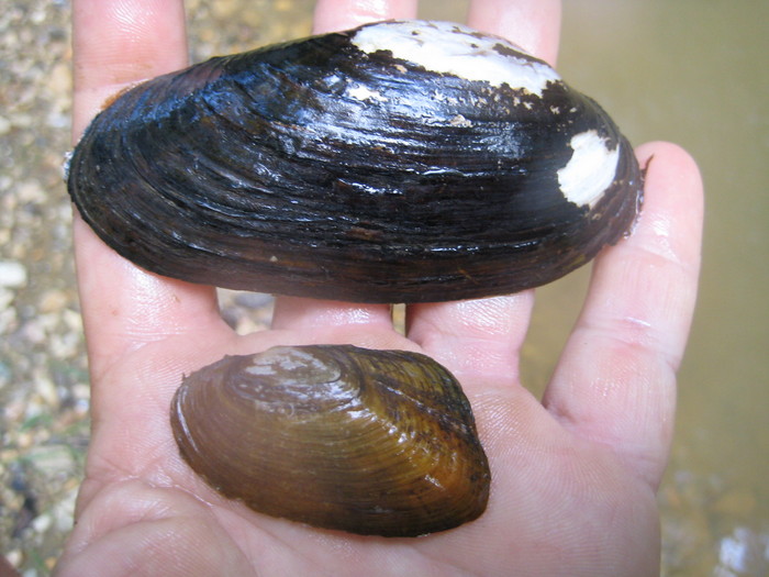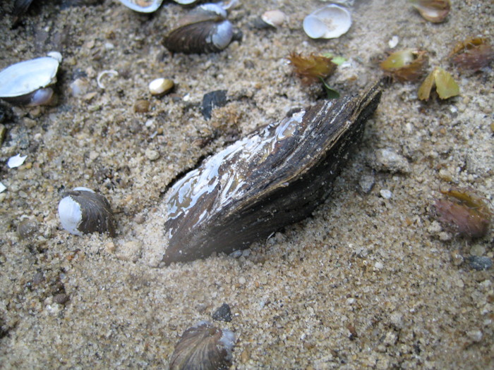 I also found about ten mussels stranded on the beach where we do our stream monitoring. They were tightly closed, so must have still been alive. I returned them to the water. One mussel was smaller and appears to have been a different species, perhaps Pyganodon grandis, instead of the usual Eliptio complanata.