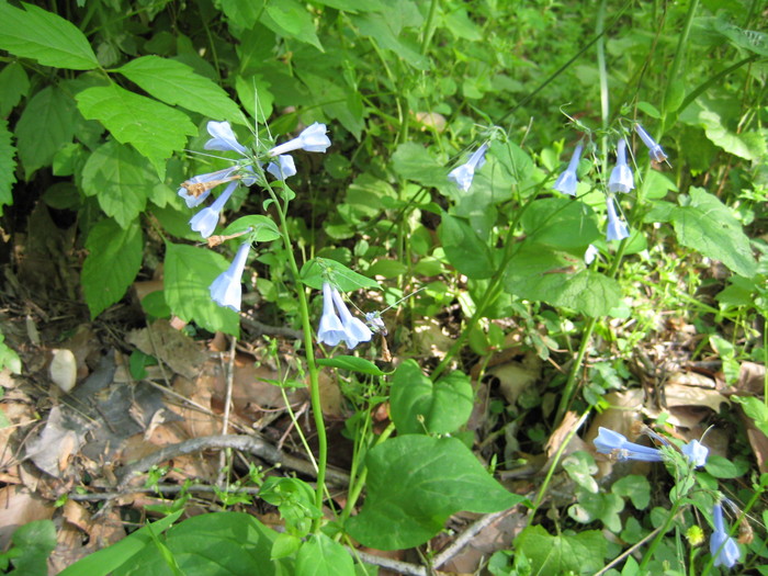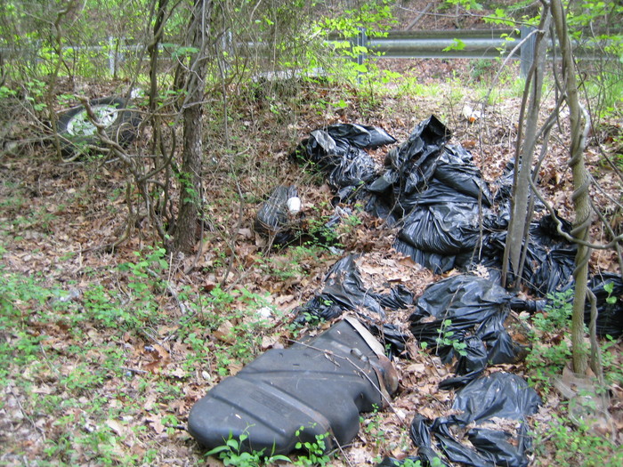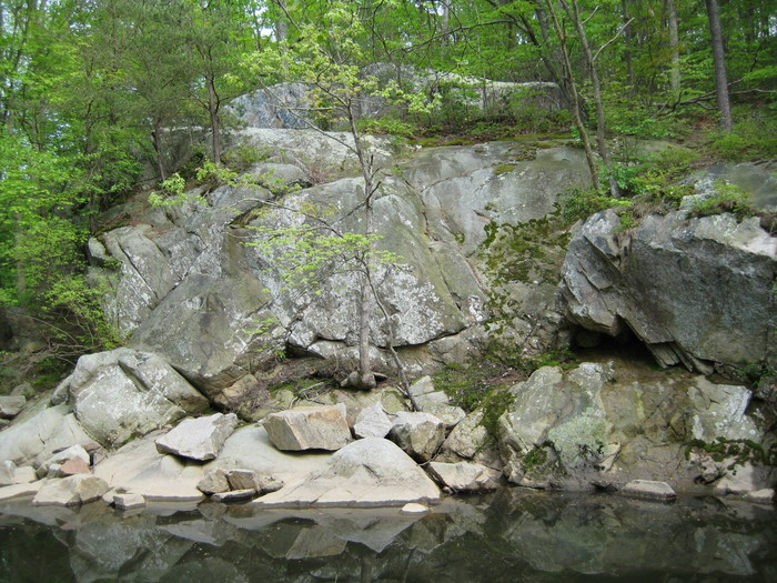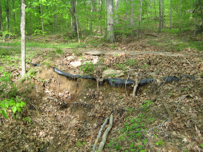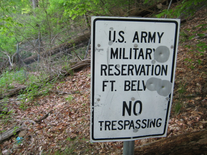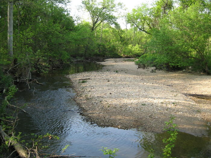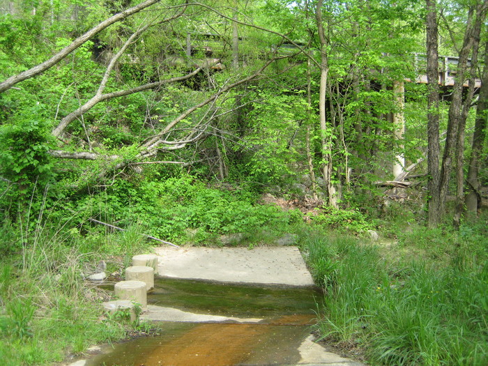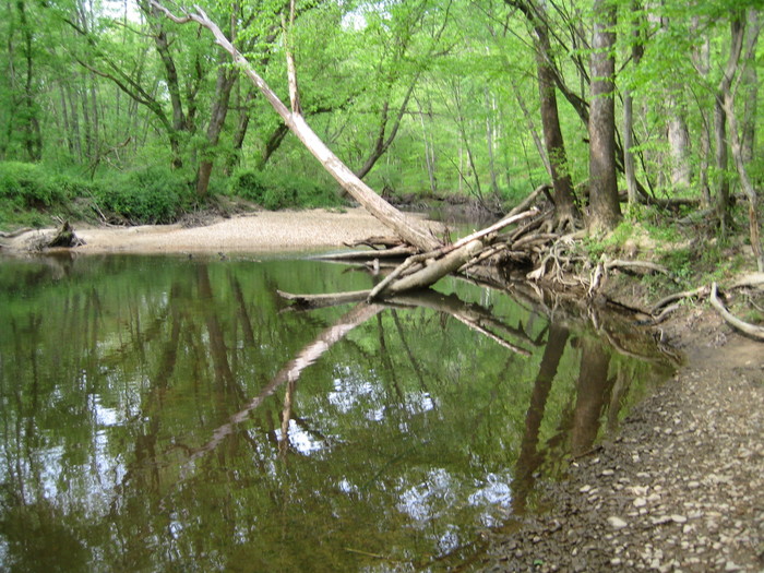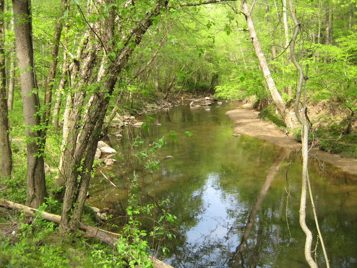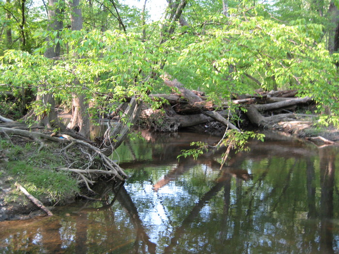 2 May 2008: Walked upstream from the north boundary of the Engineer Proving Ground (EPG) to Old Keene Mill Road along the main stem of Accotink Creek. Between the EPG and Hooes Road, Accotink Creek flows through an area of many large rock outcroppings and exposed bedrock. In places the banks show the typical steeply eroded sides. In many other places where the water flows over rock, there is little erosion visible. There are long stretches of slack water here. Below Hooes Rd, there are none of the logjams of erosion-toppled trees so common along other sections of Accotink Creek, and above Hooes Road there are only two. Buffer is good here, with only a few houses visible atop the high bluffs which line the creek along much of this section. Virginia bluebells and paw paws are prevalent here, but so are many alien invasive species, such as Chinese wisteria, Oriental bittersweet, and Japanese stilt grass. There is also an unidentified flowering bulb that covers large areas and must also be an invasive alien species. Land ownership on both banks below Hooes Road is a patchwork of park and private land. There are no signs to mark any boundaries and few indications of private use of land here. One sign of prior private use is an abandoned in-ground swimming pool, sitting completely alone in the midst of woods below Hooes Rd. There is little trash below Hooes Rd, but there is some roadside dumping at the Hooes Road bridge. Also at the bridge, a nasty invasive alien species, Japanese knotweed, has established itself. The Franconia-Springfield Parkway (7900) bridge is just above Hooes Rd. Between the two, a small tributary joins from the east. Previous attempts to reinforce its course are failing, with much riprap displaced and geotextile exposed. Also between the two bridges is an especially large rock outcropping which seems to be a gathering spot for the young, judging from the wear visible on top. It is kept reasonably clean, however, at least on this day. The 7900 bridge abutments are used as colorful graffiti walls, but none seems to be offensive. At Hooes Rd, a paved trail begins on the east bank which leads upstream, then eastward into the Greensprings retirement village. Above 7900 there is also a paved trail along the west bank. This is part of the Cross County Trail (CCT). The pavement becomes gravel nearing Old Keene Mill Rd. Major changes are coming to the CCT here. The pavement is to be extended and rerouted through the woods and a concrete bridge to be added just below the Old Keene Mill Road bridge. Additional information on CCT paving Two eastern tributaries join Accotink Creek between 7900 and Old Keene Mill Rd. One is Calamo Branch. The other, unnamed, also has a failing reinforcement project. Three tributaries join from the west along this stretch, all unnamed. A gas line cut crosses the creek here. There is a significant amount of trash in the woods below the cut, carried there during flooding. There is also a sewer line cut, not as regularly maintained as some, which has evolved into a series of pools. Buffer is also good here, with only a few houses to be seen atop the eastern bluffs. The west bank is flatter and broader here than below Hooes Rd. The entire west bank is park here, as is the east bank near Greensprings. There is little Chinese wisteria above Hooes Rd, but all other invasive species are the same. This section of the creek is largely spared dense thickets of multiflora rose, but it is present. Photos: