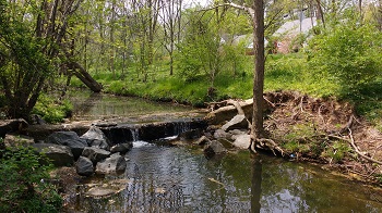 21 April, 2016: Walked upstream from the Pickett Road bridge, following the main stem of Accotink Creek through Fairfax City to its last upstream open water, a culvert under Hallman Street, near the intersection of Rt. 50 and Rt. 236.