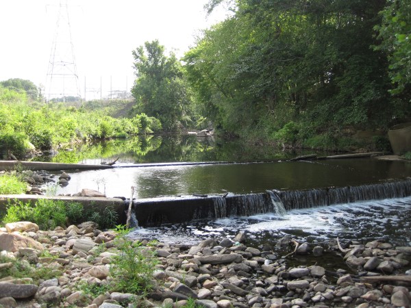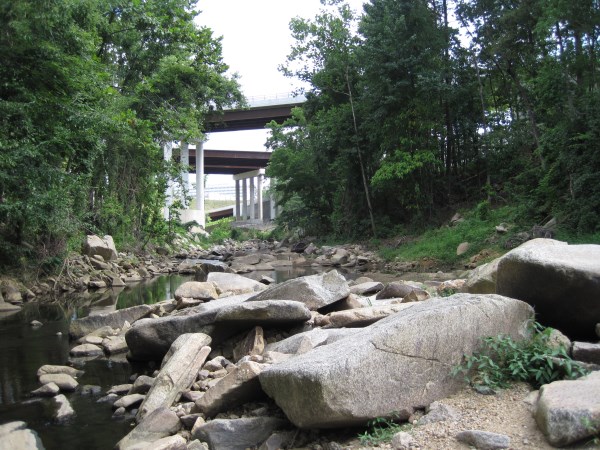 View of Accotink Creek below Fullerton Road bridge. The creek runs over boulders and bedrock.