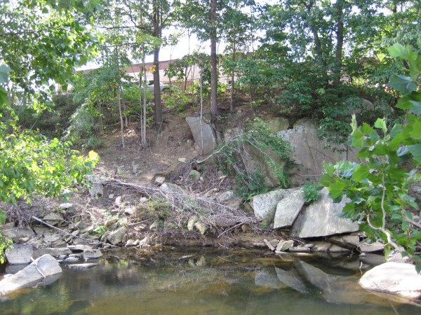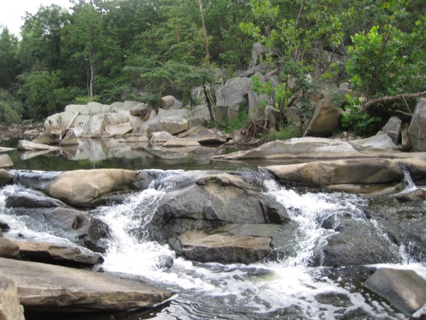 View of Accotink Creek above Fullerton Road running over boulders and bedrock