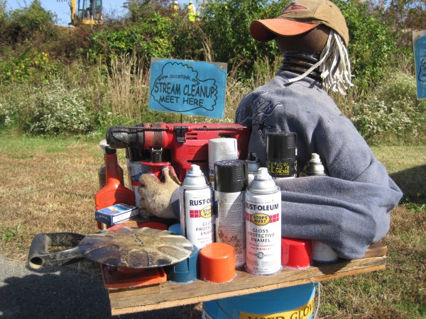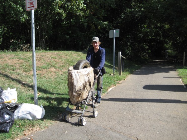 Heather Breiner, Bill Nell, Olivier Giron, and Philip Latasa represented FACC at our first two cleanup sites. At our Fairfax Blvd. site, we had mild sunny weather and nine volunteers. The Adopt-A-Spot volunteers of the Harley-Davidson dealership were also at work, getting trash off the street before it reached the stream. Thanks, Harley-Davidson! Our most unusual find here was a rusty bicycle. At our Chain Bridge Road site, sunny skies turned cloudy and rain threatened, but stayed away. Our small turnout of four volunteers found trash conditions to be unusually bad for this headwaters location. We would have needed dozens of volunteers and many hours to make the kind of difference we would like to. We took a break from our efforts for a visit from the Clean Coast Project art group, who brought two of their trash sculptures to display and engaged in discussion of their efforts to call attention to trash issues. Our most unusual find at this site was a GPS unit – perhaps it took a wrong turn into the creek? As we arrived at our Old Lee Hwy site, the weather was clearing, but was too breezy to raise our tent. Otherwise, conditions were excellent. Olivier and Bill had to leave us, but Roger Diedrich joined to represent FACC. Five volunteers also came out. Trash conditions were pretty bad here also. As usual, we found the bottom of the creek carpeted with golf balls from the adjacent Army-Navy Country Club. Unusual finds here included a new paint roller, a bicycle in such good condition we were able to ride it around, and a shopping cart a team of volunteers labored hard to excavate from the streambed.