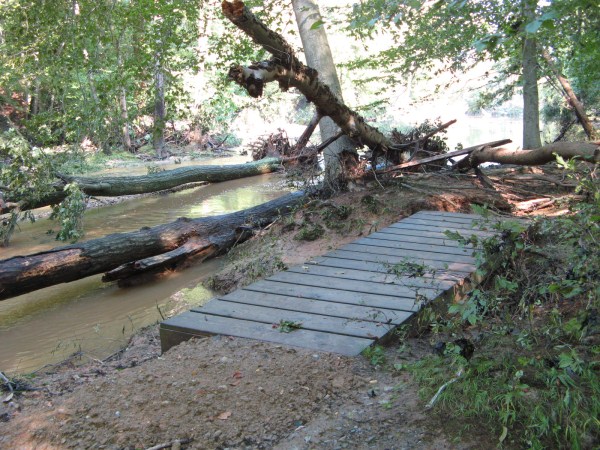 Erosion and downed trees at Accotink Creek footbridge,