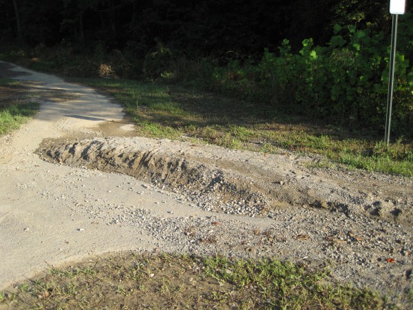 Washout of new trail pavement below Lake Accotink dam spillway.