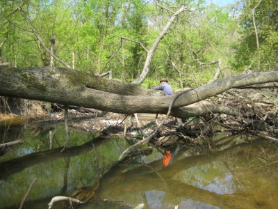 Balancing on logs to reach trash trapped in deep water. Erosion from excess storm drain runoff brings down many streamside trees.
