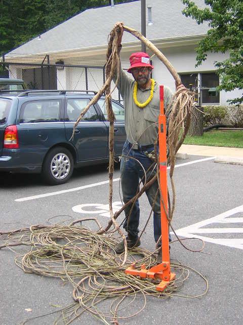 The Weed Wrench can be fairly effective at removing Kudzu tubers. Place the jaws on the narrow spot below the crown of the root (some digging may be necessary), keep one foot on the jaws to maintain a tight grip, and rock the lever to gradually loosen the tuber. Lengthier tubers may require repositioning the jaws lower and lower to extract the tuber bit by bit. This Kudzu tuber is 12 feet long and the attached vines are 70 feet. (We later learned the secret of avoiding this back-breaking task - these huge tubers will die in the ground if cut just below the crown - much simpler!)
