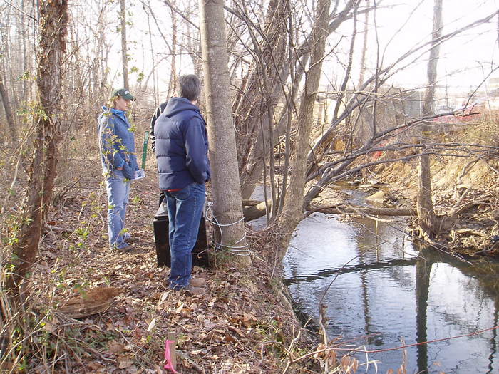 EPA stream monitoring device. Left to right; Philip Latasa, Jeanne Classen and Bryant Thomas