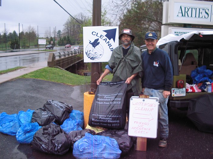 Friends of Accotink Creek and Northern Virginia Trout Unlimited braved a rainy morning. Thanks to all for participating with the Friends of Accotink Creek in the 18th Annual Alice Ferguson Foundation Potomac Watershed cleanup. In spite of the foul weather, near the Audrey Moore RECenter at Wakefield Park we removed 66 bags of trash and near Old Lee Highway we removed 17 bags of trash.. The total haul included three bottles of toxic motor oil, nine tires and many beer bottles.
