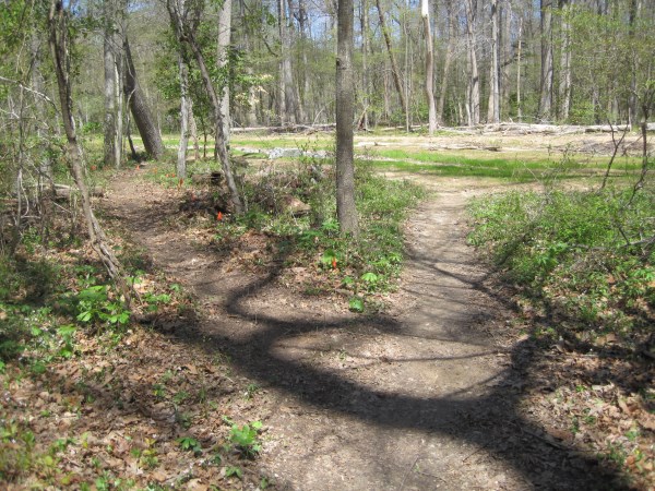 Perplexed mountain bikers are creating multiple trails along reseeded access road.